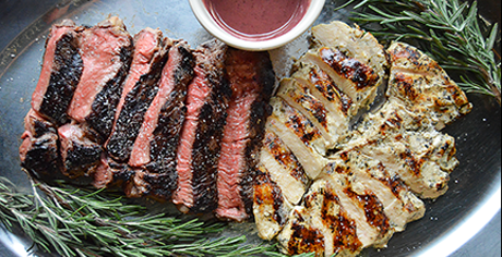 Turf & Turf - Grilled Churrasco, pan seared chicken breast, mashed potatoes, sautéed vegetables, in a tomato cream sause.